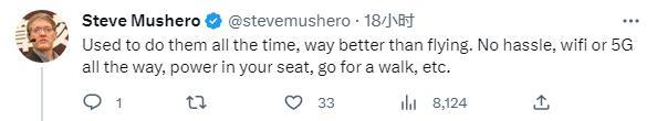 曾在中國工作多年的企業(yè)家Steve Mushero也留言說,“我以前一直坐高鐵,比坐飛機(jī)好多了。不麻煩,一直有wifi或5G,你的座位上有電源,還可以散散步等?!?/p>