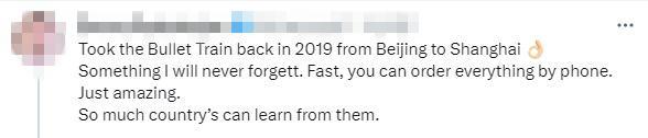 還有網(wǎng)友說,“2019年坐高鐵從北京到上海。一些事我永遠(yuǎn)不會忘記。速度很快。太棒了。很多國家可以向他們學(xué)習(xí)?!?/p>