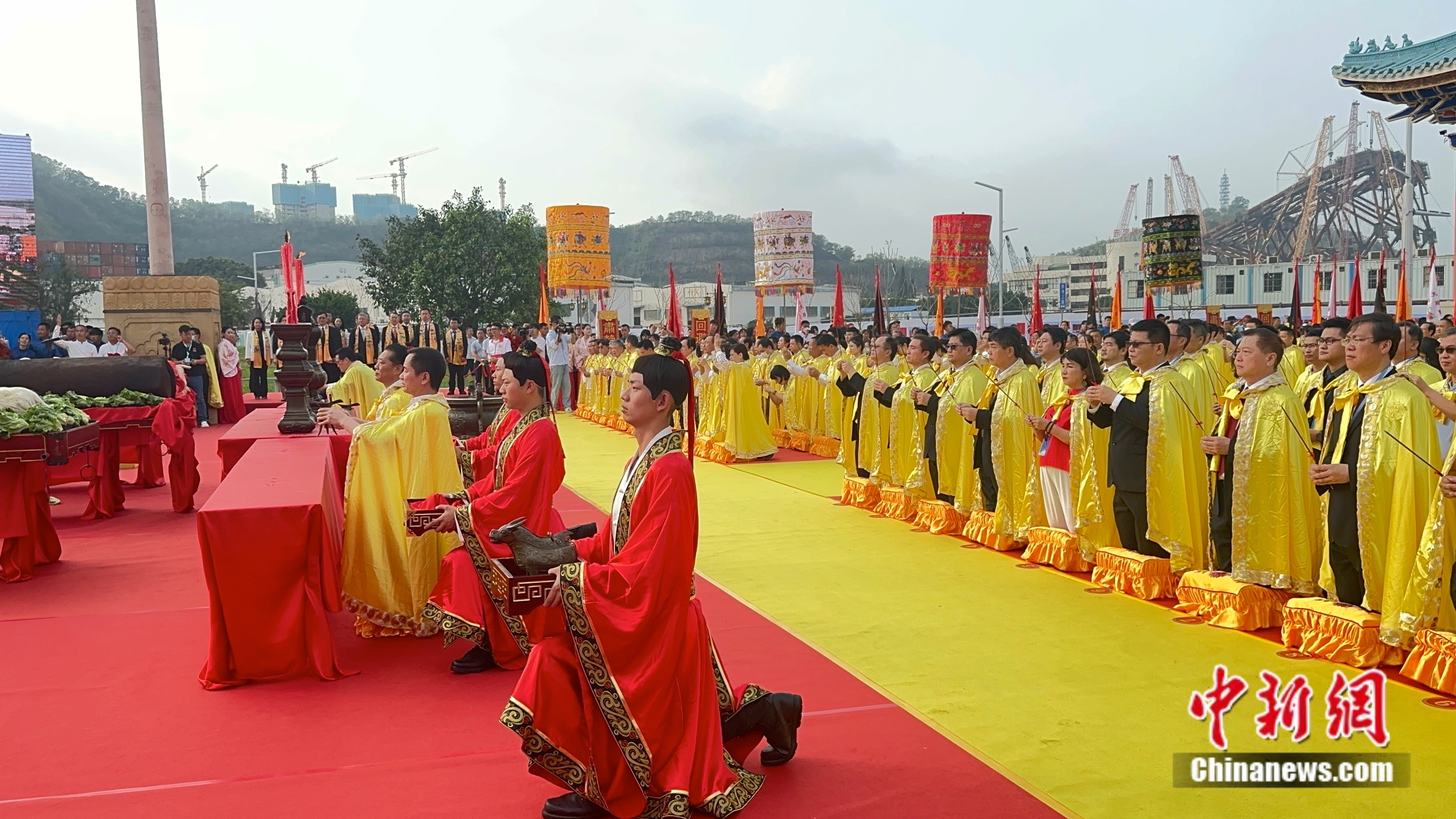 上午7點30分,正祭儀式正式開始。深圳南山天后博物館遵循古制,恢復(fù)古禮,結(jié)合嶺南傳統(tǒng)文化,再現(xiàn)明代“辭沙”祭祀的場景。大典現(xiàn)場,祭祀嘉賓和承獻官等在主持人的引導(dǎo)下,將祭祀流程一一完整演繹。