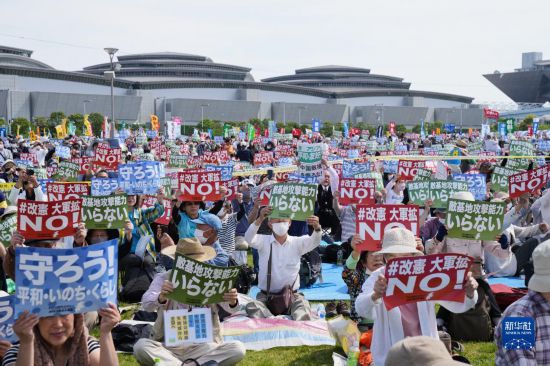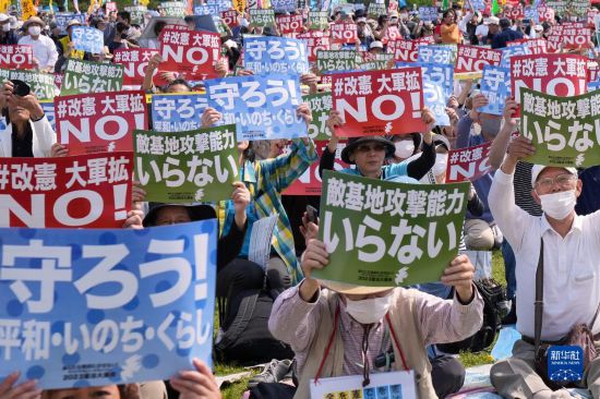 5月3日是日本憲法紀念日。當天,約2.5萬名日本民眾聚集在東京有明防災(zāi)公園的廣場上,舉行了守護憲法集會,他們打出守護憲法、反對強軍擴武、不要反擊能力、反對修改憲法等內(nèi)容的標語和旗幟,呼吁守護憲法、守護和平。
