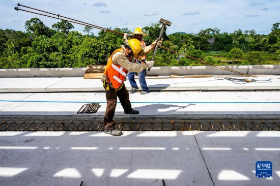 4月26日,工人在馬來西亞吉蘭丹州的馬東鐵項目一分部5號橋建設(shè)現(xiàn)場工作。新華社記者 朱煒 攝