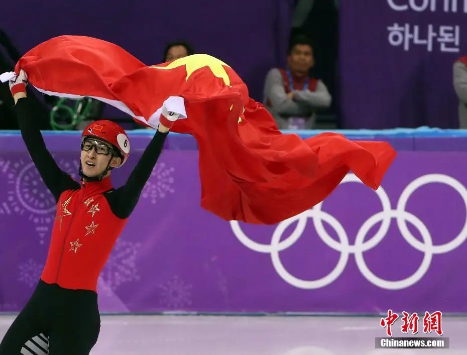 2018年2月22日,在平昌冬奧會(huì)短道速滑男子500米決賽中,中國選手武大靖奪得金牌。圖為武大靖手舉五星紅旗慶祝勝利。中新社記者 宋吉河 攝