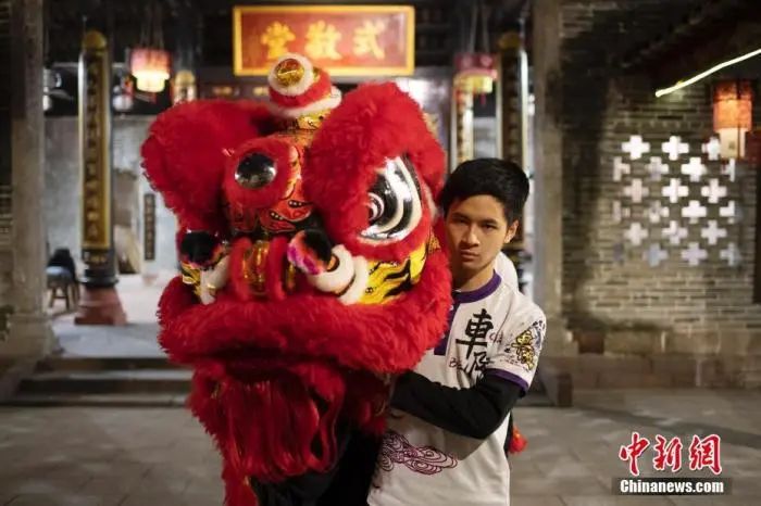 圖為2022年1月18日晚,廣州市天河區(qū)車陂龍獅體育會(huì)舞獅隊(duì)隊(duì)員王智銘在晴川蘇公祠拿著一頭紅獅。王智銘是一名“00后”,學(xué)習(xí)舞獅已3年,他說自己的目標(biāo)是“世界獅王”。 中新社記者 陳楚紅 攝