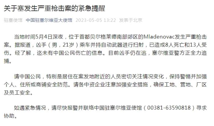 塞爾維亞發(fā)生嚴(yán)重槍擊案多人死傷 中使館發(fā)布緊急提醒