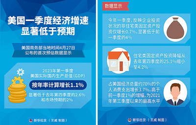 近日,美國(guó)商務(wù)部經(jīng)濟(jì)分析局?jǐn)?shù)據(jù)顯示,美國(guó)2023年一季度GDP年化環(huán)比增長(zhǎng)1.1%,大幅低于市場(chǎng)預(yù)期的2%,較去年四季度2.6%的增幅有所回落,已連續(xù)兩個(gè)季度放緩?!度A爾街日?qǐng)?bào)》網(wǎng)站報(bào)道稱,在通貨膨脹仍然高企、利率不斷上升的情況下,美國(guó)第一季度經(jīng)濟(jì)增長(zhǎng)下滑,增加了人們對(duì)今年晚些時(shí)候可能出現(xiàn)經(jīng)濟(jì)衰退的擔(dān)憂。