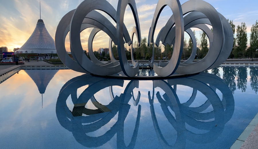 ↑哈薩克斯坦首都阿斯塔納的雕塑和遠(yuǎn)處的“可汗之帳”購物中心。