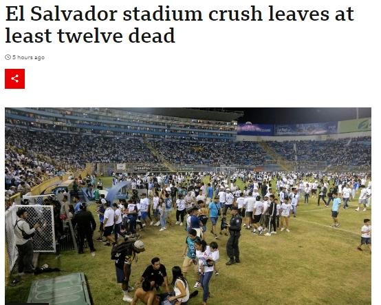 據(jù)英國廣播公司(BBC)報道,當(dāng)晚,圣薩爾瓦多庫斯卡特蘭球場舉行一場全國足球賽的四分之一決賽。不少因購買假票無法入場的球迷試圖強(qiáng)行擠入球場,其間發(fā)生人員踩踏,造成傷亡。多名傷者傷情較重。