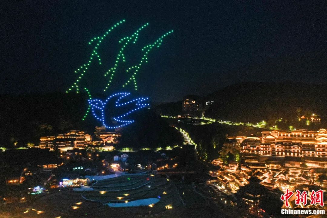 2022年6月,貴州省遵義市播州區(qū)烏江寨景區(qū)進(jìn)行無(wú)人機(jī)編隊(duì)表演。(無(wú)人機(jī)照片)瞿宏倫 攝