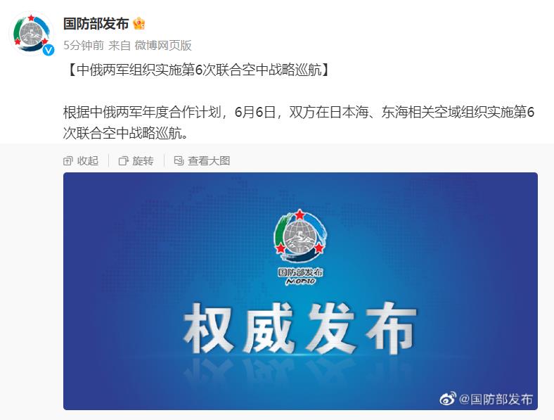 中新網(wǎng)6月6日電 據(jù)國(guó)防部新聞局官方微博消息,根據(jù)中俄兩軍年度合作計(jì)劃,6月6日,雙方在日本海、東海相關(guān)空域組織實(shí)施第6次聯(lián)合空中戰(zhàn)略巡航。