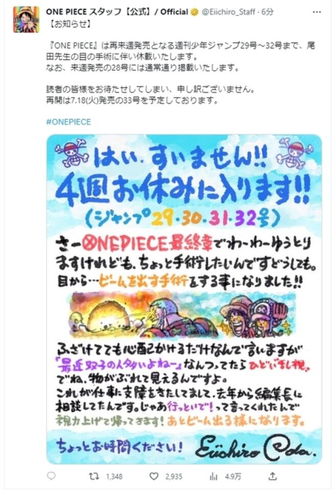 其官網(wǎng)還發(fā)布了尾田榮一郎在自己的手繪插畫(huà)上寫(xiě)的“請(qǐng)假條”。他表示:“非常抱歉,我將休息四周時(shí)間?!逗胶M酢冯m然已經(jīng)進(jìn)入終章,但由于眼睛的散光很?chē)?yán)重,看東西時(shí)出現(xiàn)重影,所以需要做個(gè)手術(shù)。請(qǐng)給我一些時(shí)間(修養(yǎng)一下)?!?/p>