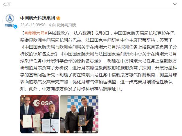中新網(wǎng)6月13日電 據(jù)中國航天科技集團有限公司官方微博消息,6月8日,中國國家航天局局長張克儉在巴黎會見歐洲空間局局長阿蘇巴赫、法國國家空間研究中心主席巴蒂斯特,簽署了《中國國家航天局與歐洲空間局關(guān)于在嫦娥六號月球探測任務(wù)上搭載月表負(fù)離子分析儀的諒解備忘錄》《中國國家航天局與法國國家空間研究中心關(guān)于在嫦娥六號月球采樣任務(wù)中開展科學(xué)合作的諒解備忘錄》,明確在中方嫦娥六號任務(wù)上搭載歐方研制的月表負(fù)離子分析儀,進行月表原位反向散射和濺射負(fù)離子探測,開展行星科學(xué)的基礎(chǔ)問題研究;明確了將在嫦娥六號任務(wù)中搭載法方氡氣探測載荷,測量月球表面的氡氣及其衰變產(chǎn)物,優(yōu)化月球氣體輸運模型,進一步完善月壤物理性質(zhì)認(rèn)知。此外,中方向法方頒發(fā)了月球科研樣品饋贈證書。