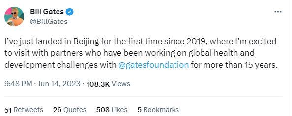 中新網(wǎng)6月14日電 北京時間14日,比爾及梅琳達(dá)·蓋茨基金會聯(lián)席主席兼理事、美國微軟公司聯(lián)合創(chuàng)始人比爾·蓋茨在社交媒體上發(fā)文稱已抵達(dá)北京。