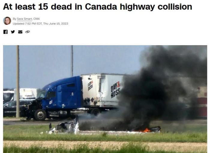 曼尼托巴省警官羅布·希爾表示,一輛載有大約25人的巴士在交叉路口與一輛半掛卡車相撞,至少15人確認(rèn)死亡,另有大約10人被送往醫(yī)院。希爾補充說,巴士上大多數(shù)是老年乘客。
