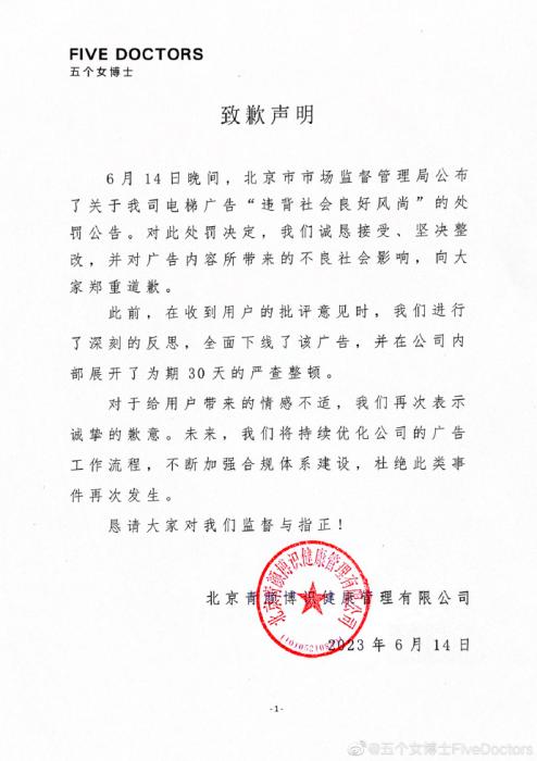 6月14日晚,“五個女博士”也在其微博發(fā)布致歉聲明稱,對此處罰決定,誠懇接受、堅決整改,并對廣告內(nèi)容所帶來的不良社會影響,向大家鄭重道歉。