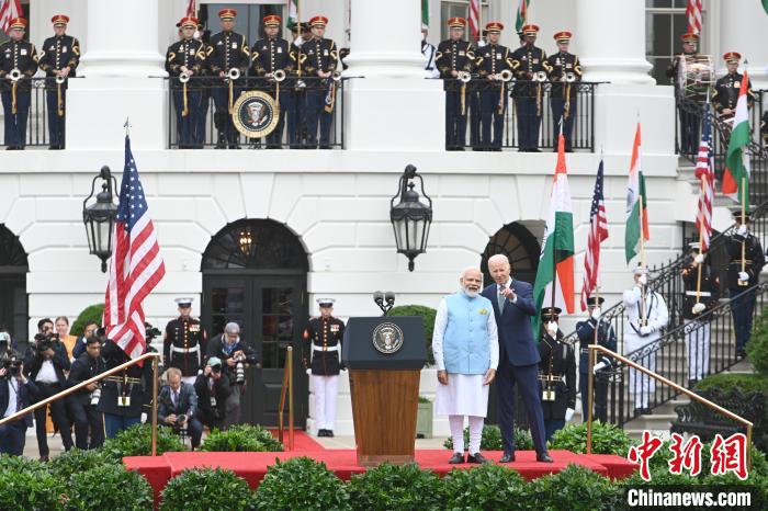 當(dāng)?shù)貢r(shí)間6月22日,印度總理莫迪對美進(jìn)行國事訪問。圖為美國總統(tǒng)拜登與莫迪出席白宮歡迎儀式。中新社記者 陳孟統(tǒng) 攝