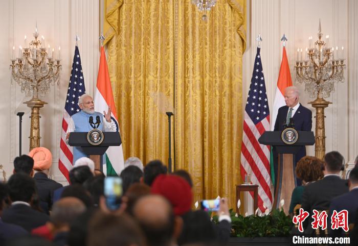當(dāng)?shù)貢r(shí)間6月22日,印度總理莫迪對美進(jìn)行國事訪問。圖為美國總統(tǒng)拜登與莫迪在白宮出席聯(lián)合記者會。中新社記者 陳孟統(tǒng) 攝