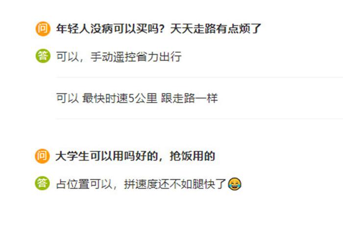 中新財(cái)經(jīng)注意到,在電商平臺上電動(dòng)輪椅的問答區(qū),不少消費(fèi)者都對電動(dòng)輪椅展現(xiàn)出了濃厚的興趣,“年輕人沒病可以買嗎?天天走路有點(diǎn)煩了?!薄按髮W(xué)生可以用嗎?”“食堂搶飯用!神器?!薄澳贻p人也可以用,省力出行。”