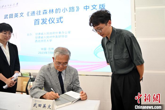 2023年7月8日,武田英文著作《通往森林的小路》中文版首發(fā)儀式在蘭州舉行。圖為武田英文給現(xiàn)場(chǎng)嘉賓簽名?!≈行律缬浾?九美旦增 攝