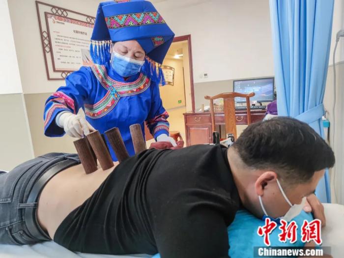 南寧市廣西國際壯醫(yī)醫(yī)院民族醫(yī)療特色診療中心,壯醫(yī)醫(yī)師為病人進行藥物竹罐療法。陳冠言 攝