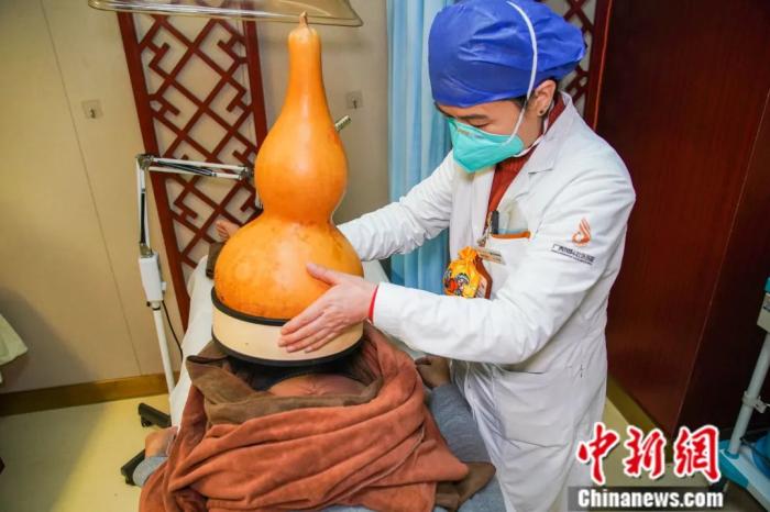 南寧市廣西國際壯醫(yī)醫(yī)院民族醫(yī)療特色診療中心,壯醫(yī)醫(yī)師為進行壯醫(yī)天陰陽臍環(huán)穴針法治療的患者蓋上艾灸葫蘆。陳冠言 攝