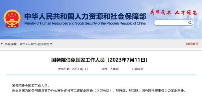 任命周霽為國務(wù)院港澳事務(wù)辦公室分管日常工作的副主任(正部長級),鄭雁雄、鄭新聰為國務(wù)院港澳事務(wù)辦公室副主任。