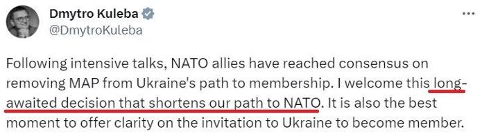 烏克蘭外長庫列巴說,這將“縮短烏克蘭加入北約的進(jìn)程”,是烏方“期待已久的決定”。