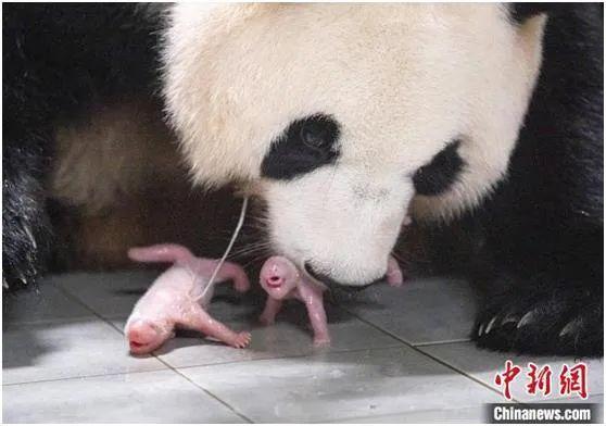 當?shù)貢r間2023年7月7日,大熊貓“愛寶”在韓國三星愛寶樂園產(chǎn)下雙胞胎幼崽。圖為“愛寶”與幼崽。 (韓國三星愛寶樂園供圖)