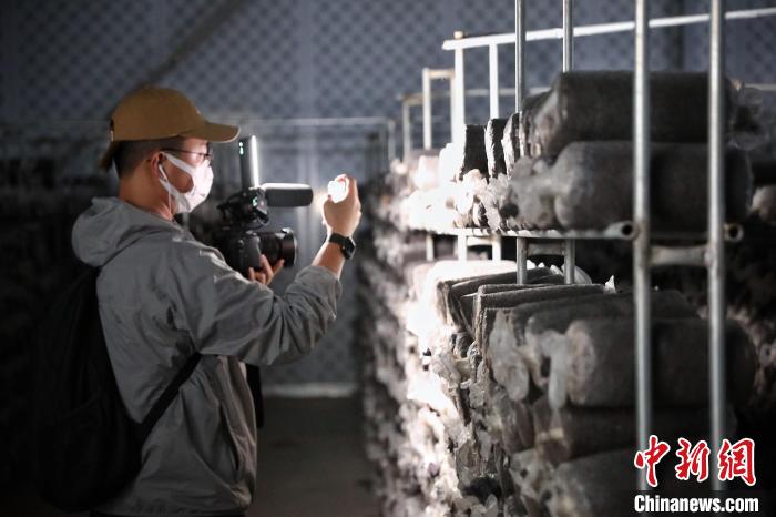 7月17日,甘肅省古浪縣,參加“絲路風采 如意甘肅”聯(lián)合采訪活動的兩岸及香港記者在當?shù)仞B(yǎng)菌出菇的冷庫內(nèi)采訪拍攝?!≈行律缬浾?李雪峰 攝