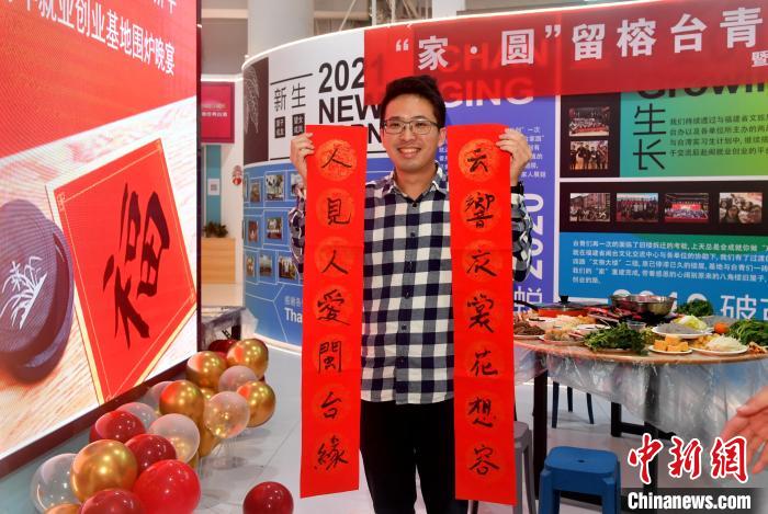 圖為魏辰運(yùn)參加留榕臺(tái)青圍爐守歲話新年活動(dòng)并展示自己寫的春聯(lián)。呂明 攝