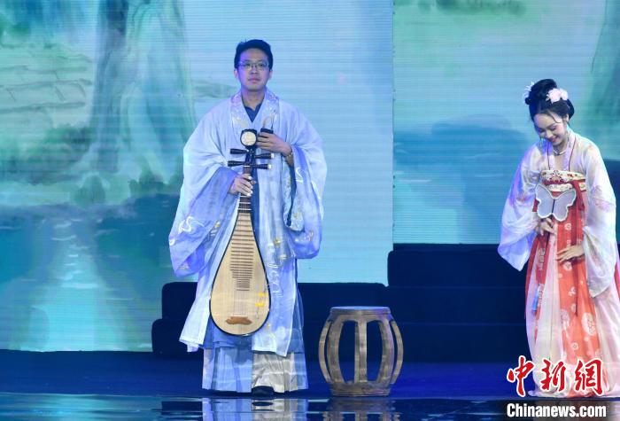 圖為魏辰運(yùn)(左)在福州舉辦的海峽漢服節(jié)上登臺(tái)表演琵琶彈奏。呂明 攝