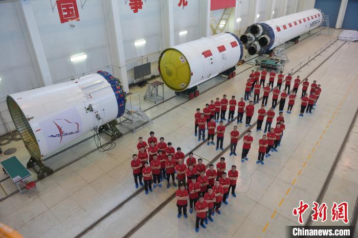 8月1日,長(zhǎng)征四號(hào)丙運(yùn)載火箭研制團(tuán)隊(duì)站成數(shù)字“100”的隊(duì)形。(中國航天科技集團(tuán)有限公司八院 供圖)
