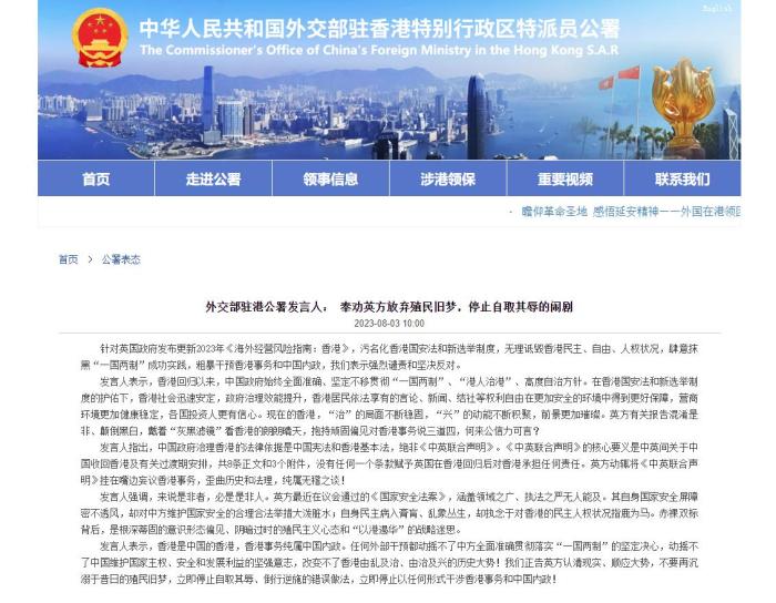 中新網(wǎng)8月3日電 據(jù)外交部駐港公署網(wǎng)站消息,針對(duì)英國政府發(fā)布更新2023年《海外經(jīng)營風(fēng)險(xiǎn)指南:香港》,污名化香港國安法和新選舉制度,無理詆毀香港民主、自由、人權(quán)狀況,肆意抹黑“一國兩制”成功實(shí)踐,粗暴干預(yù)香港事務(wù)和中國內(nèi)政,外交部駐港公署表示強(qiáng)烈譴責(zé)和堅(jiān)決反對(duì)。