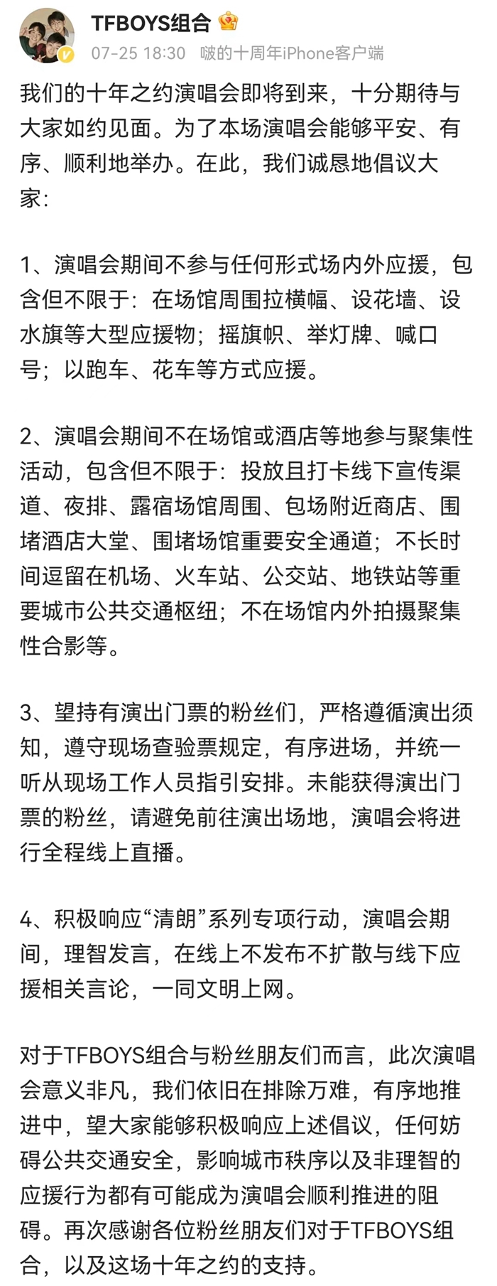 早前,TFBOYS組合官微曾發(fā)布聲明,再三呼吁大家一定要理智,尤其提到任何妨礙公共交通安全,影響城市秩序以及非理智的應援行為都有可能成為演唱會順利推進的阻礙。