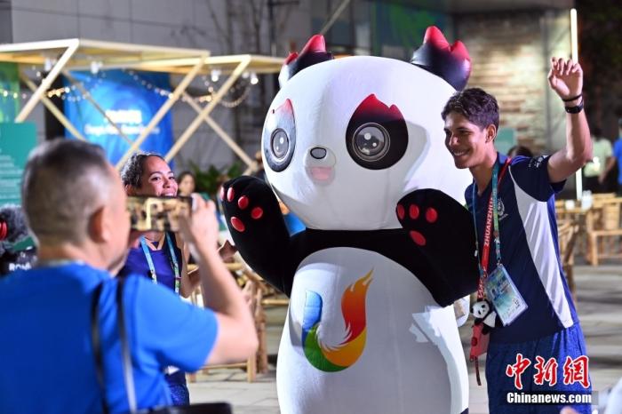 資料圖:參賽運(yùn)動(dòng)員在大運(yùn)村與“蓉寶”合影。中新社記者 九美旦增 攝