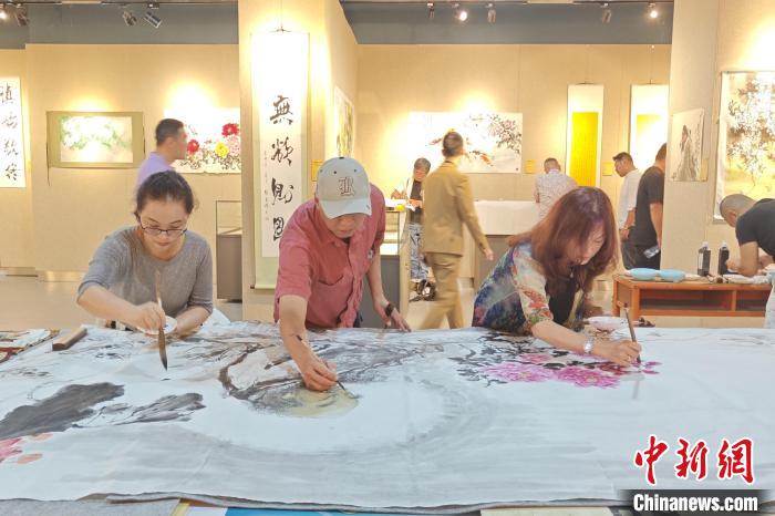 8月9日,張明琴(右一)在福建泉州與藝術(shù)家們共繪國(guó)畫作品?!枪跇?biāo) 攝