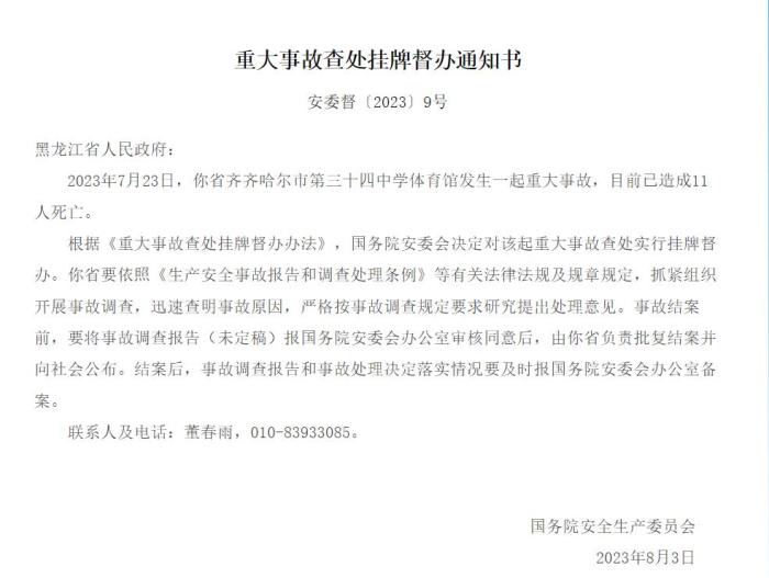 中新網(wǎng)8月14日電 據(jù)應(yīng)急管理部網(wǎng)站14日消息,國(guó)務(wù)院安委會(huì)發(fā)布重大事故查處掛牌督辦通知書(shū)。2023年7月23日,黑龍江省齊齊哈爾市第三十四中學(xué)體育館發(fā)生一起重大事故,目前已造成11人死亡。根據(jù)《重大事故查處掛牌督辦辦法》,國(guó)務(wù)院安委會(huì)決定對(duì)該起重大事故查處實(shí)行掛牌督辦。