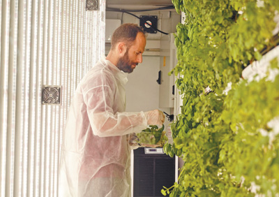 以色列一家農(nóng)業(yè)科技公司在超市、餐館和購(gòu)物中心的室內(nèi)外安裝了多處便攜式城市垂直農(nóng)場(chǎng)裝置。在這樣的“農(nóng)場(chǎng)”中,蔬菜垂直排列在墻壁上的容器里,減少對(duì)水和土壤的使用,提高種植效率,供顧客選購(gòu)。圖為一名工作人員在一家超市旁的垂直農(nóng)場(chǎng)查看蔬菜生長(zhǎng)情況。