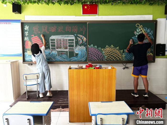 在一間教室里,來自夏村中學(xué)的教師丁玲正帶著學(xué)生徐俊熙繪制迎接新生的黑板報(bào),有大船、海浪、向日葵等圖案。徐俊熙開學(xué)上初二,他對記者說:“這個(gè)黑板報(bào)的主題‘乘風(fēng)破浪向前沖’,是為了激勵(lì)同學(xué)們要堅(jiān)強(qiáng)起來,不畏困難,積極向上。”