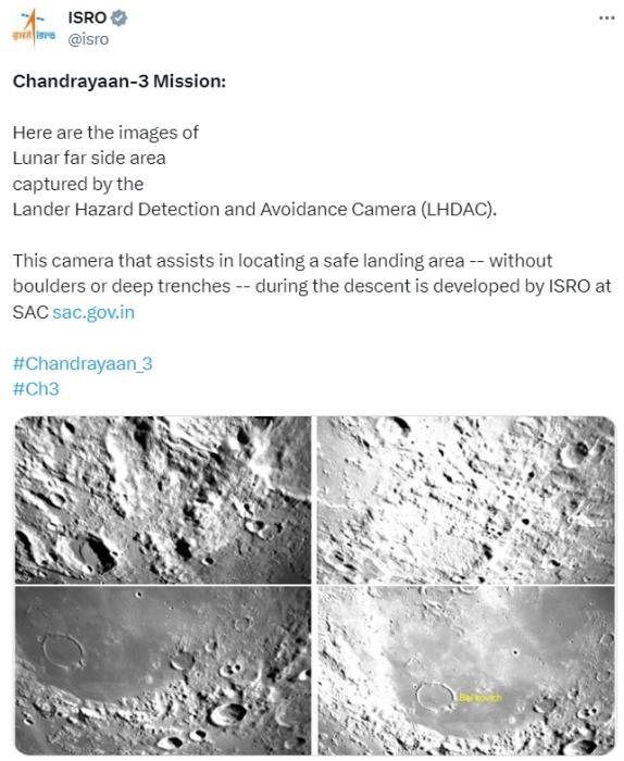 當(dāng)?shù)貢r(shí)間8月21日,ISRO在社交媒體上發(fā)布了“月船3號”上的LHDAC相機(jī)(著陸器危險(xiǎn)探測與規(guī)避相機(jī))拍攝的月球表面圖像。圖片來源:ISRO社交賬號截圖