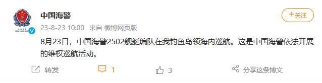 中新網(wǎng)8月23日電 據(jù)中國海警局官方微博消息,8月23日,中國海警2502艦艇編隊在中國釣魚島領海內(nèi)巡航。這是中國海警依法開展的維權巡航活動。