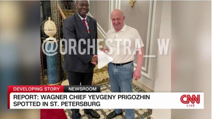 在圣彼得堡舉行的俄非峰會(huì)期間,“瓦格納”組織創(chuàng)始人普里戈任被拍到和與會(huì)非洲代表握手。(圖片來源:美國(guó)有線電視新聞網(wǎng)視頻截圖)