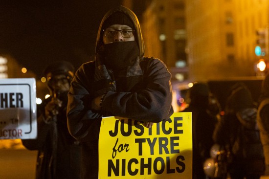 1月27日,在美國(guó)首都華盛頓,人們?cè)诎讓m前抗議非洲裔男子泰爾·尼科爾斯遭警察毆打身亡。新華社發(fā)(亞倫攝)