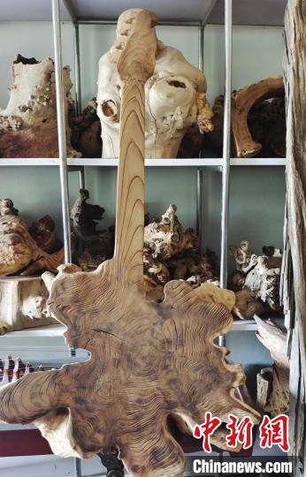 52歲的戴新是新疆生產(chǎn)建設(shè)兵團(tuán)第一師十團(tuán)苗木基地的技工,因長(zhǎng)年癡迷于根雕藝術(shù),依靠當(dāng)?shù)囟鄻拥牧謽I(yè)資源制作各類根雕,不僅建起根雕廠,還利用閑置的房屋,分門別類設(shè)立了多間根雕展示廳。