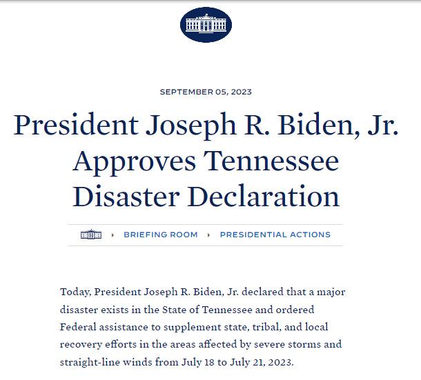 美國(guó)總統(tǒng)拜登批準(zhǔn)田納西州重大災(zāi)難聲明