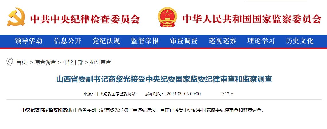 - 山西省委副書記商黎光接受中央紀委國家監(jiān)委紀律審查和監(jiān)察調(diào)查