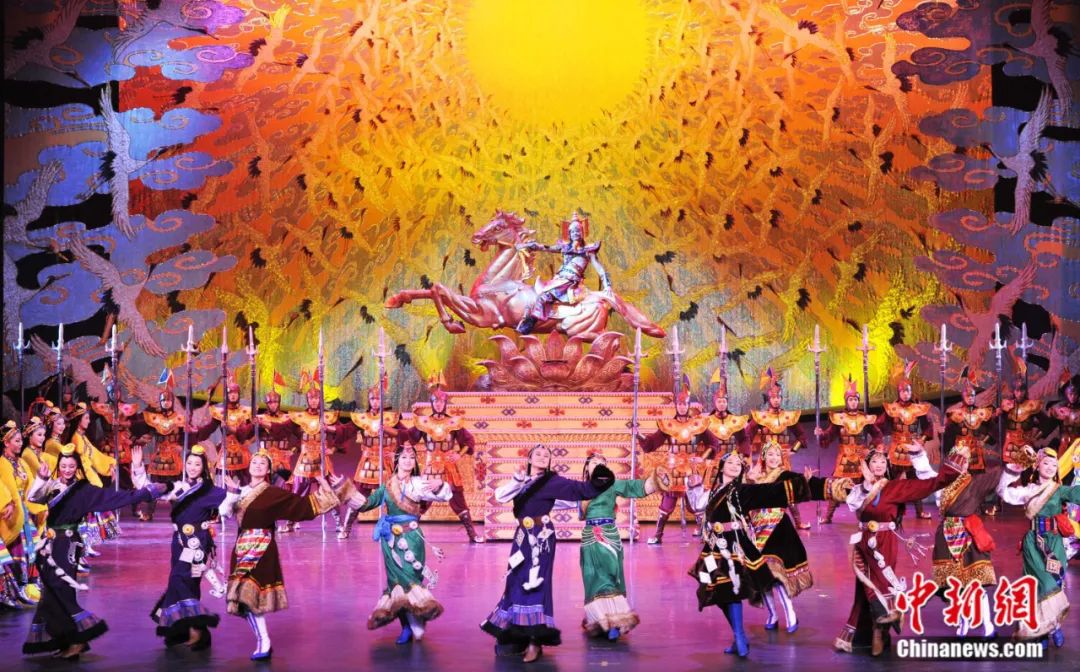 取材于藏族英雄史詩(shī)《格薩爾王傳》的大型原創(chuàng)民族舞劇《英雄格薩爾》演出劇照。安源 攝