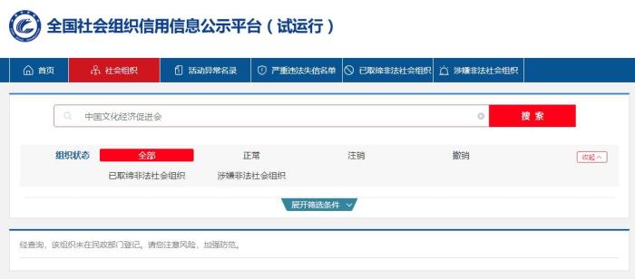 但中新財(cái)經(jīng)記者在全國社會組織信用信息公示平臺查詢發(fā)現(xiàn),中國城市雕塑建設(shè)研究院、中國文化經(jīng)濟(jì)促進(jìn)會均未在民政部門登記。