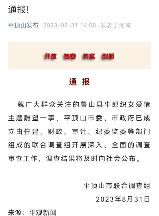 8月31日,“平頂山發(fā)布”公眾號發(fā)布通報(bào),就廣大群眾關(guān)注的魯山縣牛郎織女愛情主題雕塑一事,平頂山市委、市政府已成立由住建、財(cái)政、審計(jì)、紀(jì)委監(jiān)委等部門組成的聯(lián)合調(diào)查組開展深入、全面的調(diào)查審查工作,調(diào)查結(jié)果將及時(shí)向社會公布。
