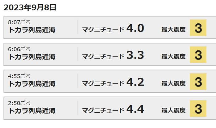 據(jù)報道,4次地震的震級分別為4.4級、4.2級、3.3級和4.0級,震中都位于鹿兒島縣吐噶喇列島附近,附近的土島村有明顯震感。