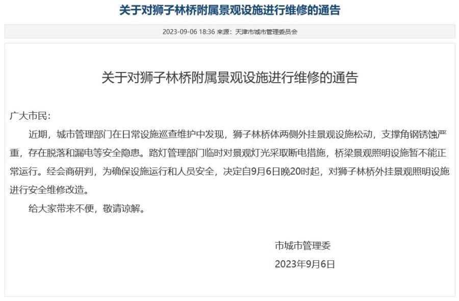 中新網(wǎng)9月7日電 6日,天津市城市管理委員會(huì)發(fā)出通告,對(duì)獅子林橋附屬景觀設(shè)施進(jìn)行維修。天津市城市管理委表示,近期,城市管理部門在日常設(shè)施巡查維護(hù)中發(fā)現(xiàn),獅子林橋體兩側(cè)外掛景觀設(shè)施松動(dòng),支撐角鋼銹蝕嚴(yán)重,存在脫落和漏電等安全隱患。路燈管理部門臨時(shí)對(duì)景觀燈光采取斷電措施,橋梁景觀照明設(shè)施暫不能正常運(yùn)行。經(jīng)會(huì)商研判,為確保設(shè)施運(yùn)行和人員安全,決定自9月6日晚20時(shí)起,對(duì)獅子林橋外掛景觀照明設(shè)施進(jìn)行安全維修改造。